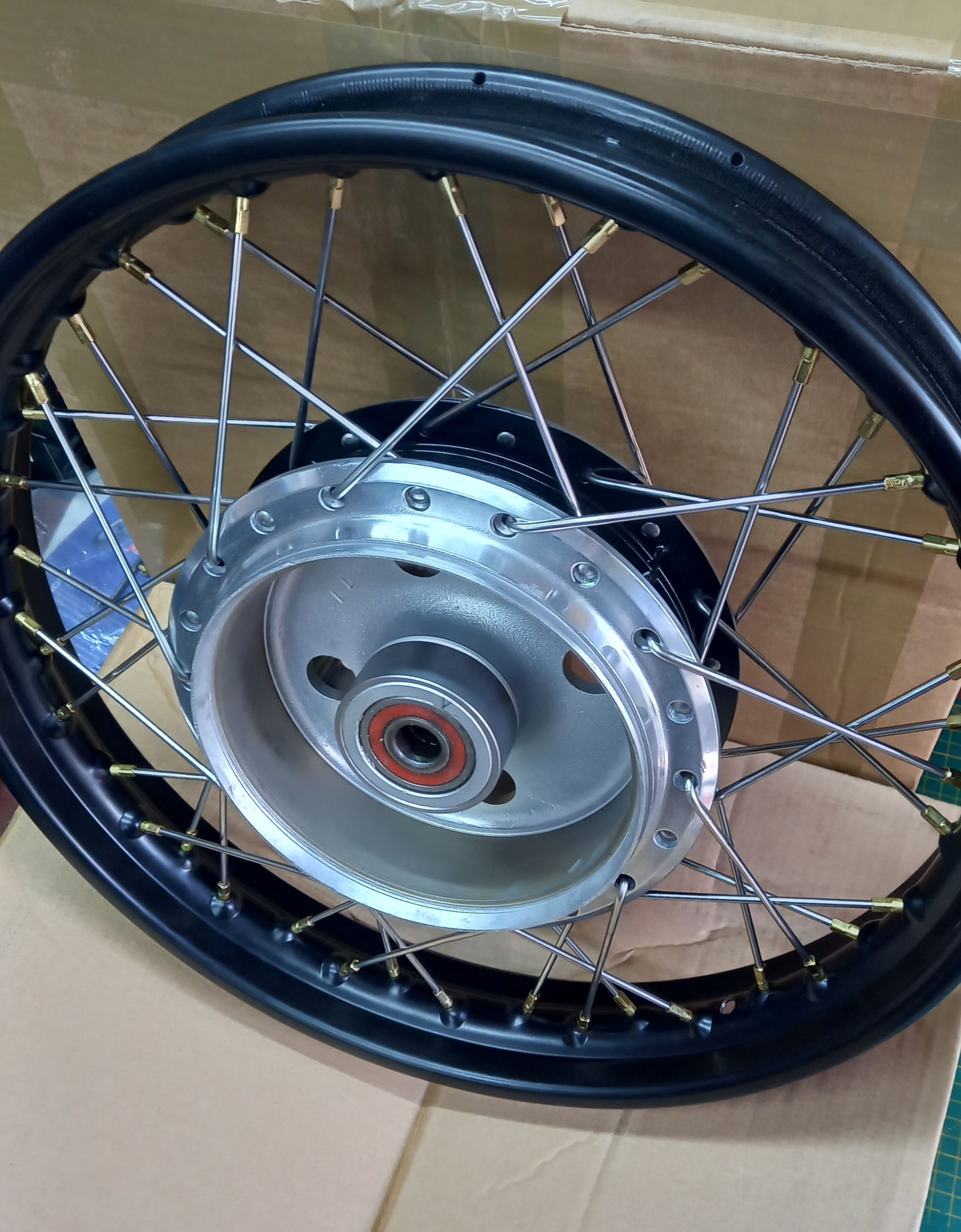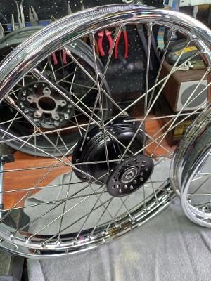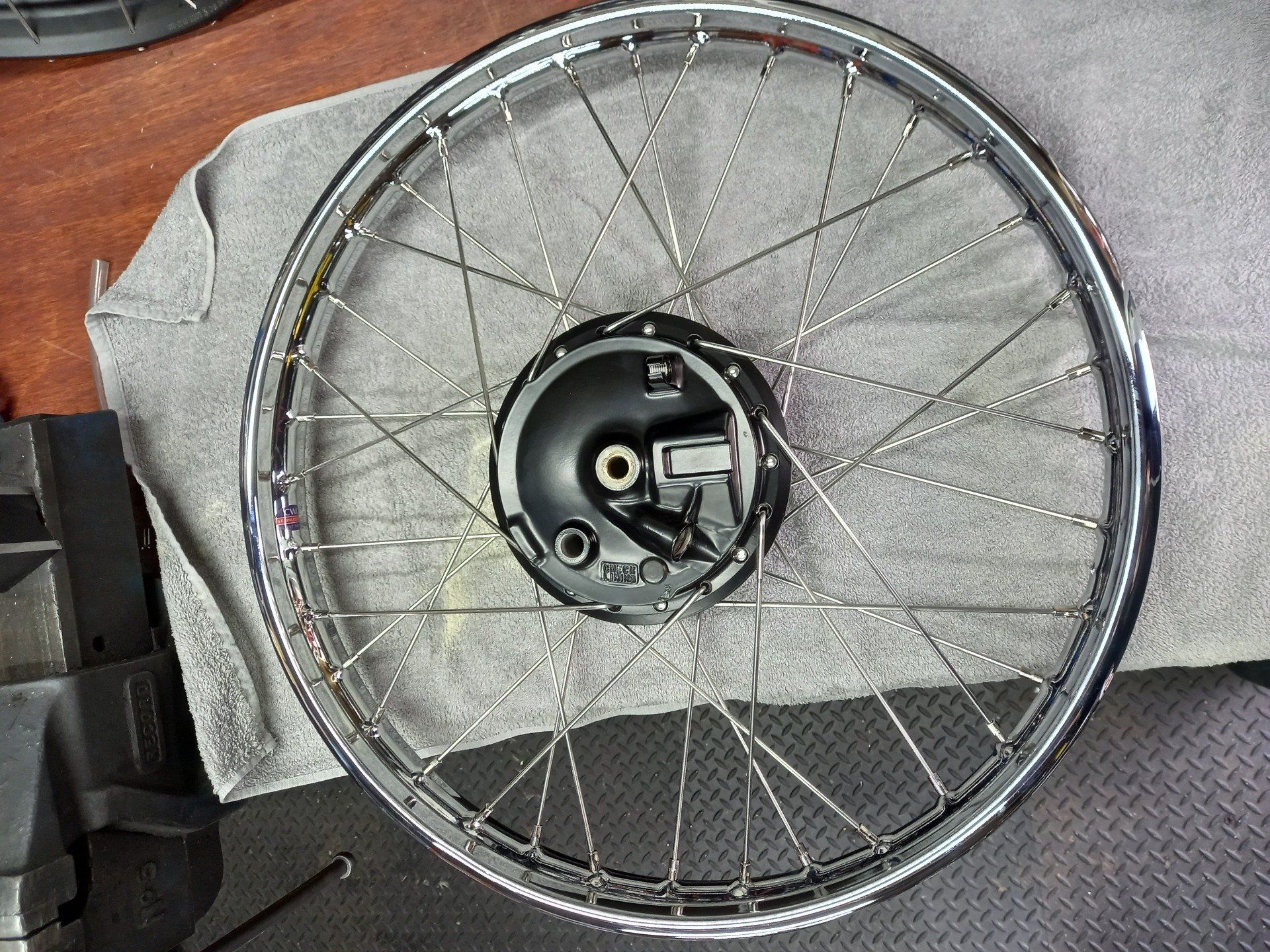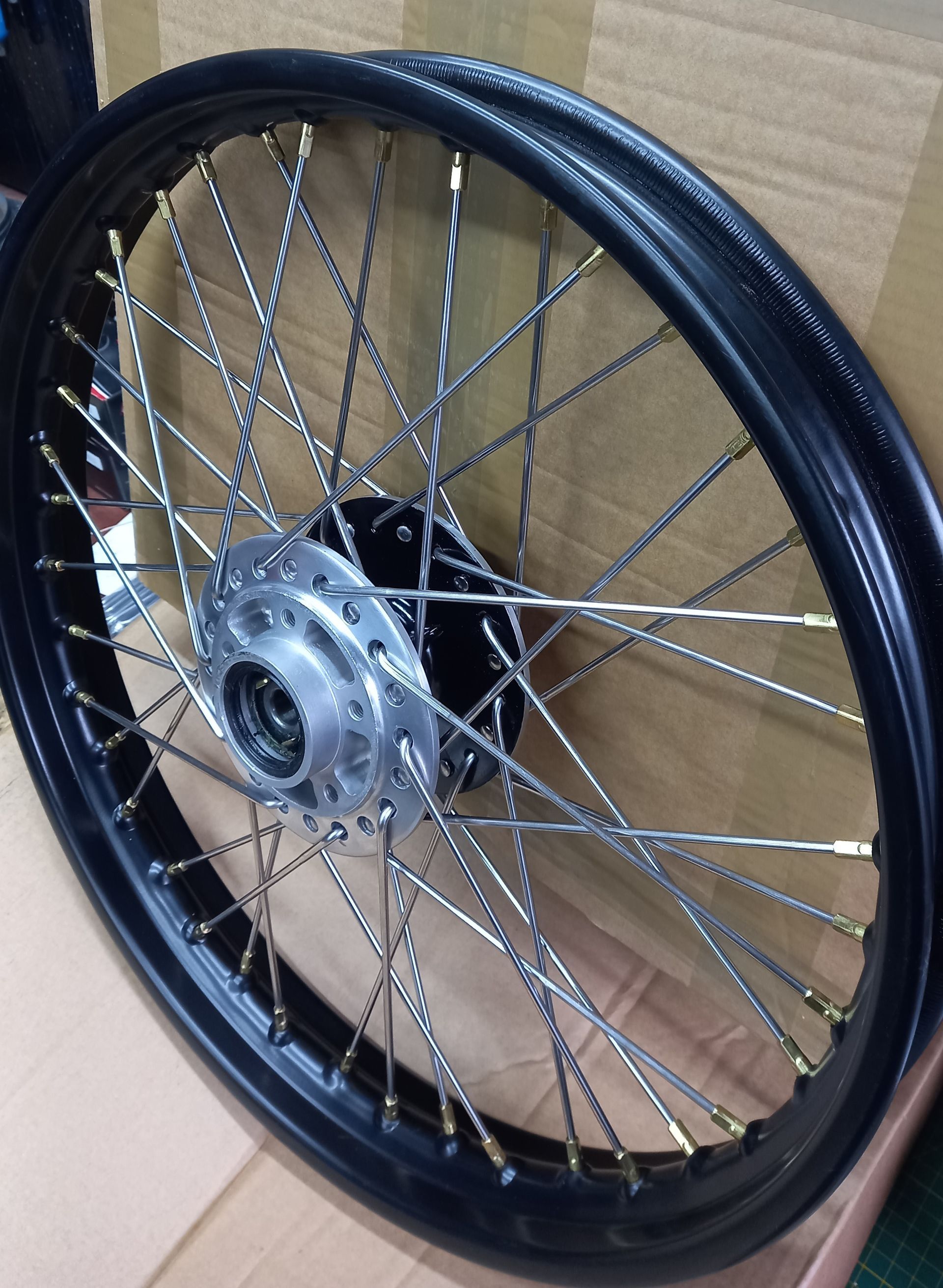 Slightly different Honda wheels with black rims, half polished Hubs, Stainless spokes with Brass nipples.
