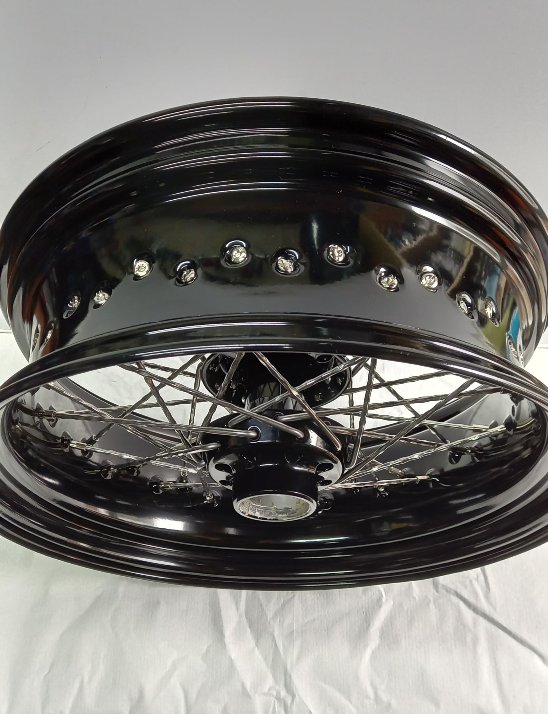One off Harley wheel with Twisted Stainless steel spokes. Believe it not this is now a coffee table !